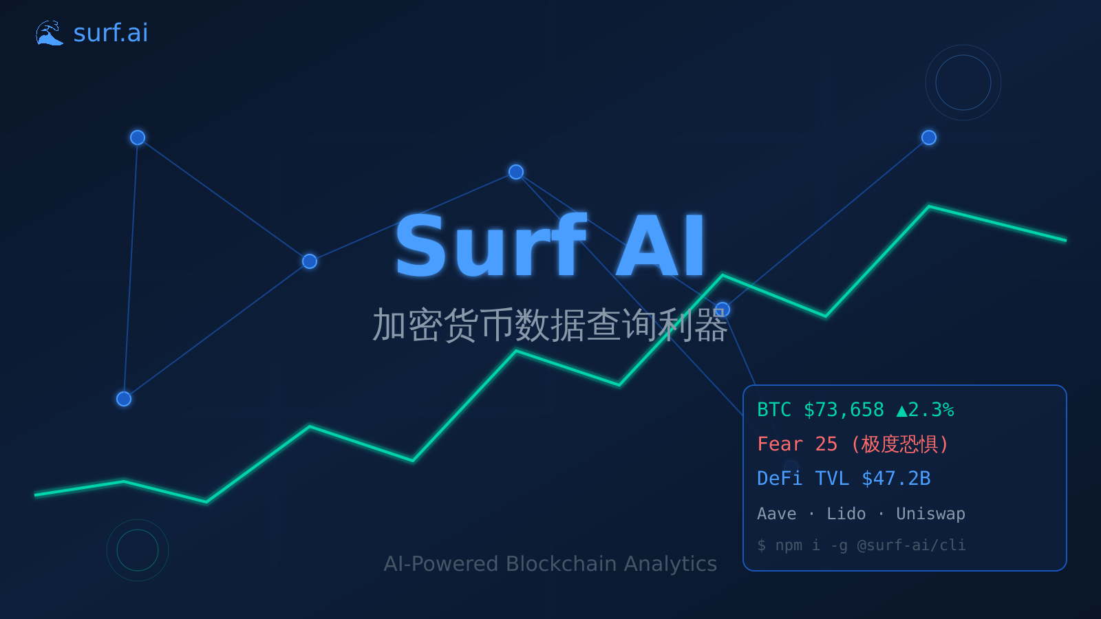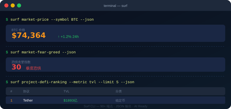 Surf(官网 agents.asksurf.ai)是一个面向AI代理和开发者的加密货币数据平台,官方将其定位为"Crypto Intelligence for AI Agents"。它的核心产品是一个名为surf的CLI工具,提供90多个端点,覆盖市场价格、钱包持仓、DeFi协议指标、社交媒体舆情、链上SQL查询、预测市场数据等14个领域。简单理解:Surf就像是加密货币领域的"数据瑞士军刀",把所有主流数据源封装成统一的CLI接口,AI代理可以直接调用,普通用户也可以在终端里轻松查询。