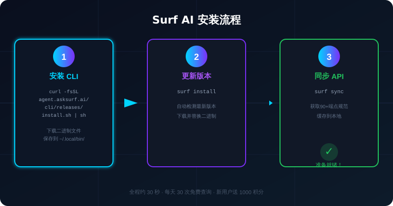 安装完成后,建议先运行surf sync命令同步API规范缓存,这个操作会从服务器获取最新的接口列表,确保你能够使用Surf支持的全部90多个端点。完整的使用前准备只需三步:安装CLI、运行install更新到最新、运行sync同步API缓存。之后你就可以开始查询数据了。