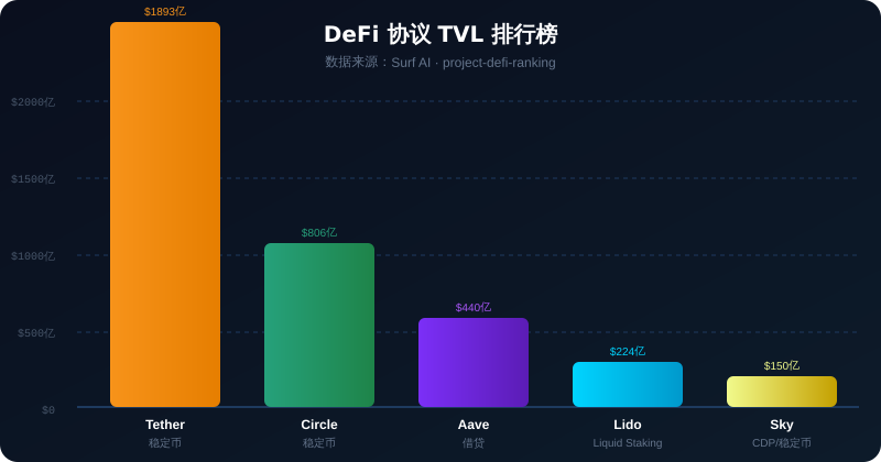 Aave以约440亿美元位列第三,Lido Finance约224亿美元排第四,Sky(原MakerDAO)约150亿美元排第五。这个排名清晰地反映了当前加密货币借贷和质押市场的格局。