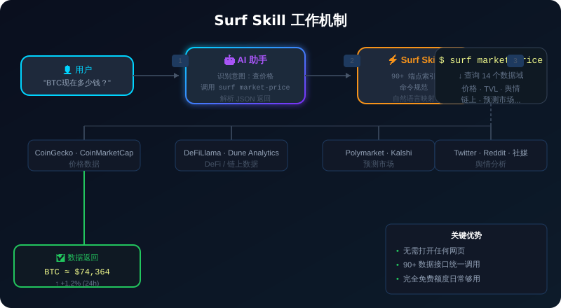 如果你经常需要查询加密货币的价格、DeFi协议数据、链上交易记录或者预测市场的赔率,你可能已经厌倦了在各种网站之间来回切换。CoinGecko、CryptoQuant、Dune Analytics、Polymarket……每个平台都有自己的一套逻辑,API文档密密麻麻,普通人根本无从下手。现在,有一个名为Surf的AI工具可以彻底改变这种局面——它把90多个数据接口统一成一个简单的命令行工具,你只需要用自然语言描述你的需求,就能拿到结构化的数据。更重要的是,它能直接集成到AI助手中,你问我一句,我就能帮你查。